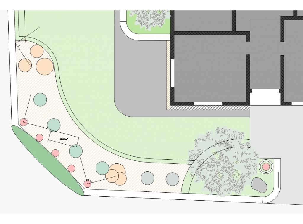 Der Garten zieht sich über die gesamte Kurve der Florastrasse. Durch die neue Bepflanzung ist die Kurve nun sehr übersichtlich und das auch für die Zukunft. Die Pflanzen sind linear von den verschiedenen Vegetationszonen der USA von Ost nach West nachempfunden. Gestartet wurde im Osten mit der bereits bestehenden Zypresse gefolgt von zwei Krüppelkiefern, einer Banana Yucca, mehreren Red Yuccas, einige Kakteen (Cane Cholla und Texas Pricklypear) und als Abschluss drei Beaked Yuccas. Nur wenige kleinere Begleitpflanzen kommen aus anderen Kontinenten. Ein Vlies wurde als Trennschicht integriert so dass kein Unkrautbewuchs möglich ist. Abgedeckt wurde der Garten mit relativ groben Bruchsteinen aus Lichtenstein (Schellenberg).